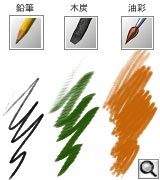タブレットによる「筆圧感知」は,PainterやPhotoshopをはじめ,多くのグラフィックソフトで実現している機能です。さらに,wacom製のタブレットを使った場合,「傾き」も感知されます。左図をご覧下さい。これはPainter8のエアブラシを使ってみたところですが,濃度に差があらわれています。これはつまり,下方向から,上方向に向かってエアブラシを吹きかけている状態です。これを,「タブレットをかたむける」だけで実現するのが,Painterの特徴です。