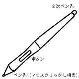 「ペン型のマウスみたいなもの」と,よく説明されます。たしかに,その通りで,ペン型なので自分の思ったように線をひくことができます。左は,一般的なタブレットの模式図です。ペン先が,マウスのクリックにあたります。ボタンは,一般的にダブルクリックが割り当てられています。ペン先を2回,チョンチョン,と当てることでもダブルクリックになりますが,不馴れなかたは,クリックポイントがはずれてしまう(つまりダブルクリックにならない場合がある)おそれがあるため,このような機能を追加させています。2次ペン先は,タブレットによってはついていませんが,これは一般的にはクリックと同じ機能を持ちます。対応アプリケーションによっては,この2次ペン先に特定のブラシ(消しゴムなど)を割り当てられます。