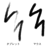 左のストロークをご覧ください。左がタブレットでひいた線。右がマウスでひいた線です。マウスは均一に線がひかれてるのに対して,タブレットは,かすれています。これは,タブレットパッドにかける手の力(圧力)を読み取り,その力具合に応じて,線の強さ(太さ)を表現しているのです。ですので,マウスよりもタブレットのほうが「持ちやすい」だけではなく,ソフトウェア的にも「実際のペンの感覚」をシミュレートしているわけです。