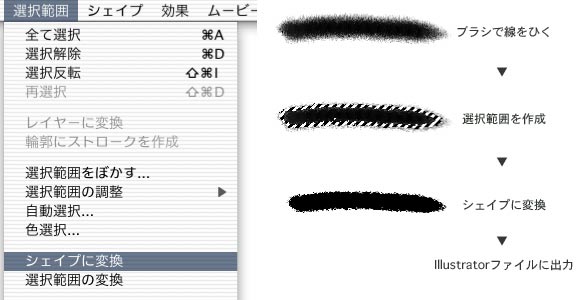 Painterで作成したシェイプを,Illustratorファイルに出力することも可能です。また,選択範囲をもとにIllustratorファイルに出力もできるので,Painterの自然なラインをIllustratorにもちこむことが可能です。