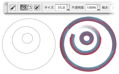 パスに吸着 『Painter IX』から搭載された新機能のなかで,なかなかあなどれない機能のひとつです。これはシェイプのストロークに吸着してブラシを動かすことができる機能で,美しいベクターデータに沿ってPainterのブラシを利用できるというものです。