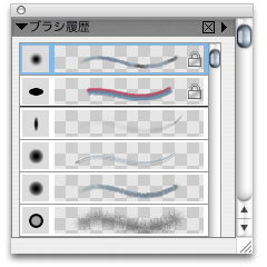 ブラシ履歴機能が強化されました。利用したブラシが,次々に履歴として記録されていき,いつでも,戻ることができます。いったんアプリケーションを終了したあとでも履歴は保持されるので,そこからブラシを選んだり,また,気に入ったバリアントはロックして常に表示することができたりと,まるで自分だけの筆立てのように使うことができます。