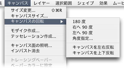 キャンバスの回転と反転ができるようになりました。これまで,レイヤー単位での回転,反転は可能でしたが,キャンバス自体の回転,反転は不可能でした。Painter IXからは,キャンバスそのものを回転,反転することが可能になります。