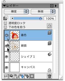 レイヤーパレットのレイヤーの表示/非表示がドラッグでも変更可能になりました。『Painter 8』以前は,レイヤーパレットの「目」をひとつひとつ,クリックしていかなくてはならないため,複数のレイヤーを同時に表示変更を行うとき,手間がかかりました。『Painter IX』では,Photoshopと同じ感覚でドラッグ操作で表示/非表示が可能になります。