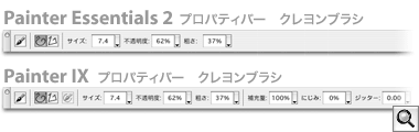 気に入ったブラシを見つけ,そのブラシをとことん使いこなす。というのが,Painterの王道だと思います。しかし,『Painter Essentials』では,いくら気に入ったブラシがあったとしても,なかなか思ったようにブラシのカスタマイズができませんでした。たとえば,クレヨンを選んだ状態で,プロパティバーに表示されるのは,サイズ,不透明度,粗さの3項目です。しかし,『Painter IX』では,これらに加えて,補充量,にじみ,ジッターの値を調節することが可能です。