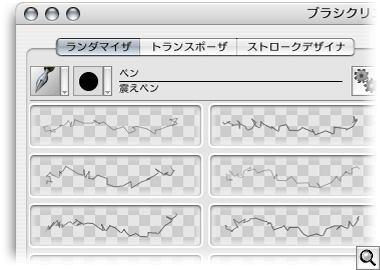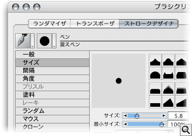 3種類の方法は,さらに,かけあわせることが可能です。例えば「トランスポーザ」で合成させたものを保存し,さらに「ランダマイザ」でランダムバリエーションを作り,そのうえで「ストロークデザイナ」で最終微調整する……なんていうこともできてしまいます。これら驚きの調整機能を搭載した「ブラシクリエータ」は,初心者から熟練者まで,誰でも好みのブラシを作ることができる,まさにパーフェクトなカスタマイズ機能なのです。 |