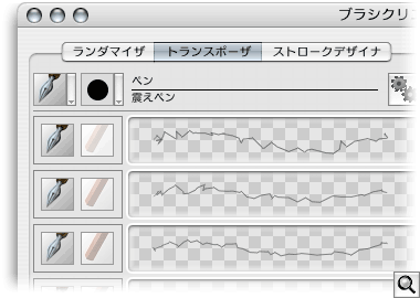2番目は「トランスポーザ」。これは,2種類のブラシ(バリアント)を選択し,そのふたつの中間のブラシを自動作成してくれるという優れもの。チョークのような描き味と油彩のような描き味をうまく融合させたものがほしい!なんていう我が儘に,見事に応えてくれます。その合成の段階も数段階にわかれているので,好みにあわせたものが,必ずできるはずです。