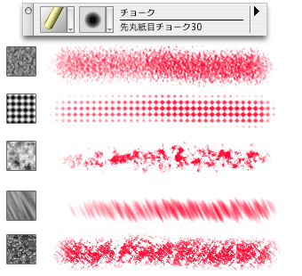 これは,同じブラシで,テクスチャを変更して線をひいてみた例です。まったく同じブラシでもテクスチャを変えるだけで,これだけ表情が変わります。きっと素材作りに役立ちます。