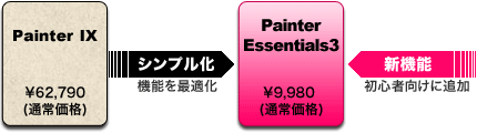 ペインターエッセンシャルズ?ここでは『Painter Essentials 3』が、いったいどういうソフトなのかを紹介していきます。 『Painter Essentials 3』って、どんなソフト?『Painter Essentials 3』は、ずばり絵を描くソフトです。 どこで手に入るの?『Painter Essentials 3』は、市販ソフトです。パソコンショップ、家電量販店など、コンピュータ関連を取り扱っているお店で購入することができます。 タブレットに付属されています『Painter Essentials 3』を単体で購入することもできますが、wacom社のタブレット『intuos 3』を購入すれば、そのなかに『Painter Essentials』が付属してきます。『intuos 3』を購入すると、『Painter Essentials』のほかに『Adobe Photoshop Elements』なども付属してくるため、これから本格的にコンピュータで絵や写真を愉しもうと思ったら、『intuos 3』を購入したほうがお得かもしれません。 ただし、『intuos 3』に付属されている各ソフトウェアが必ずしも最新版である保証はありません。ご購入前に必ずどのようなバージョンのソフトが付属されているのかご確認いただくことをおすすめします。 |