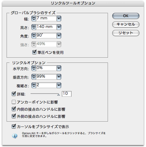 「リンクルツール」を選択したら、「リンクルツール」をダブルクリックします。すると、「リンクルツールオプション」が表示され、各設定ができるようになります。