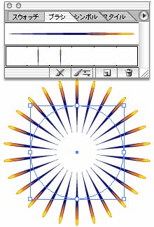 楕円形ツールで正円を描き,それに先ほど作成した「花火パターンブラシ」を適用します。左図のように,もう花火の原型ができてきました。