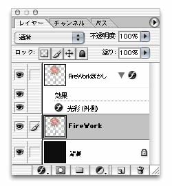先ほど,Illustratorで描いた花火を「FireWork」レイヤーとし,1枚,複製したものを上に重ねます。複製したものは,フィルタより「ぼかし(ガウス)」で適当な数値を指定し,レイヤー名は「FireWorkぼかし」とします。