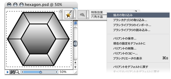 「長方形選択ツール」で、選択しておいた状態のまま、先ほど、作成した「六角水晶」バリアントを選択し、なおかつ「描点の取り込み」を選択します。